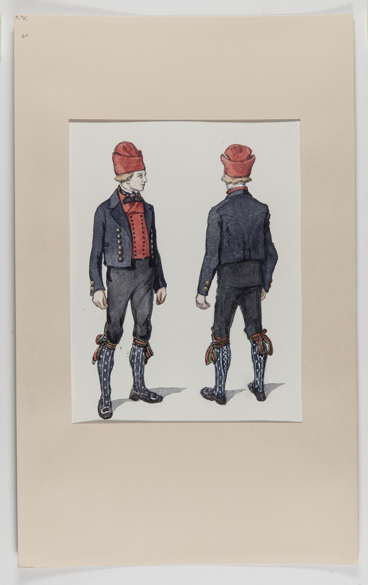 Gillesdräkt, Ljusdals socken, Hälsingland. Akvarell av Emelie von Walterstorff.