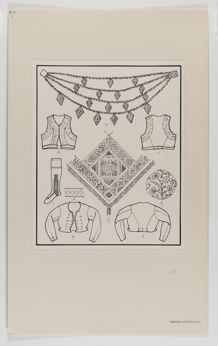 Helgdagsdräkt för gift kvinna från Östra härad i Blekinge. Teckning av Emelie von Walterstorff.