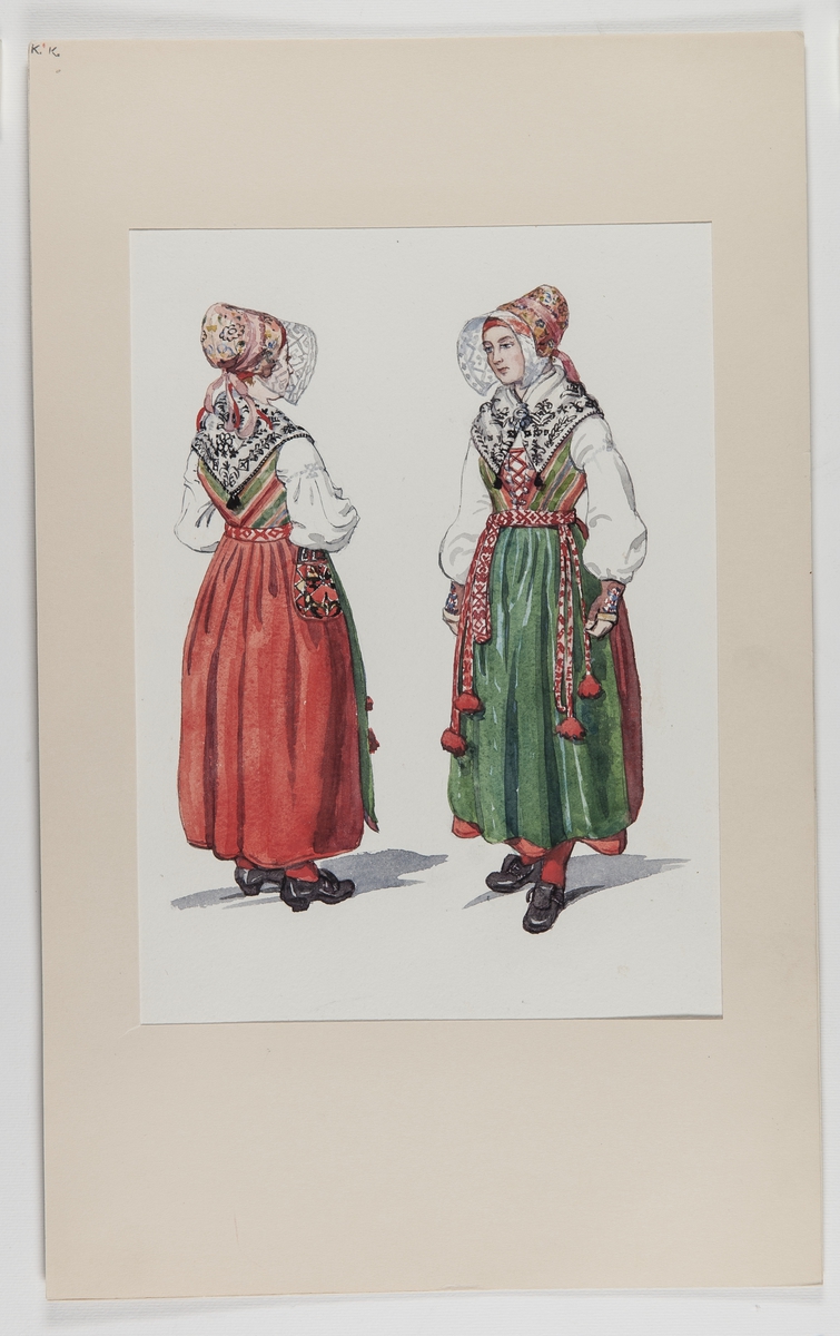 Festdräkt. Åls socken, Dalarna. Kvinnodräkt. Akvarell av Emelie von Walterstorff.