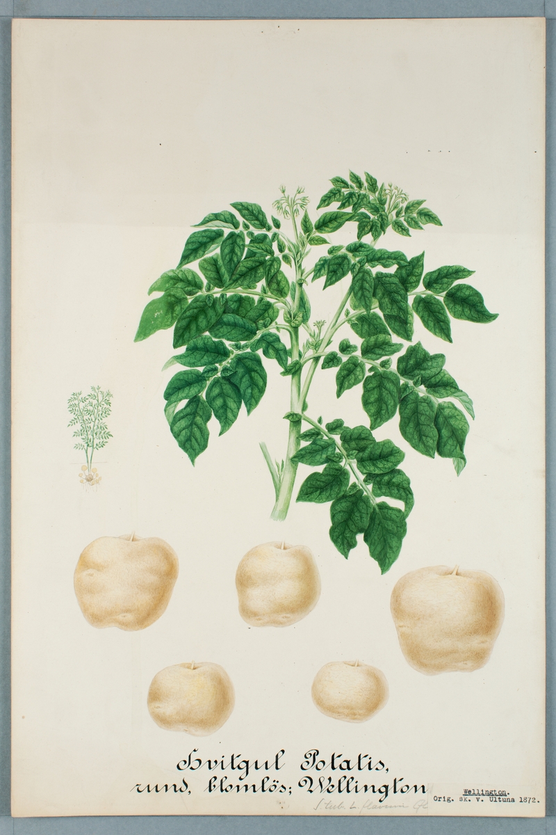 Sveriges kulturväxter. Illustration utförd av Henriette Sjöberg. Potatis, vitgul, Wellington. Odlad Ultuna 1872. Inv. nr. C101 : 326.