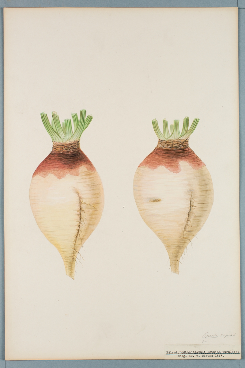 Sveriges kulturväxter. Illustration utförd av Henriette Sjöberg. Kålrot, rödtoppig, East Lothian purpletop. Odlad Ultuna 1873. Inv. nr. C101 : 290. Signerad "H.S. 79.".