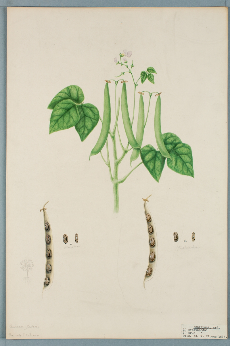 Sveriges kulturväxter. Illustration utförd av Henriette Sjöberg. Grå zebraböna, a. svartbandad, b. brunbandad. Odlad Ultuna 1876. Inv. nr. C101 : 477.