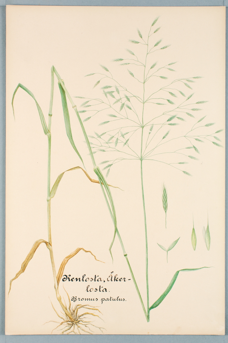 Sveriges kulturväxter. Illustration utförd av Henriette Sjöberg. Renlosta/Åkerlosta. Odlingsplats saknas 1886. Signerad "H.S. 1886.".