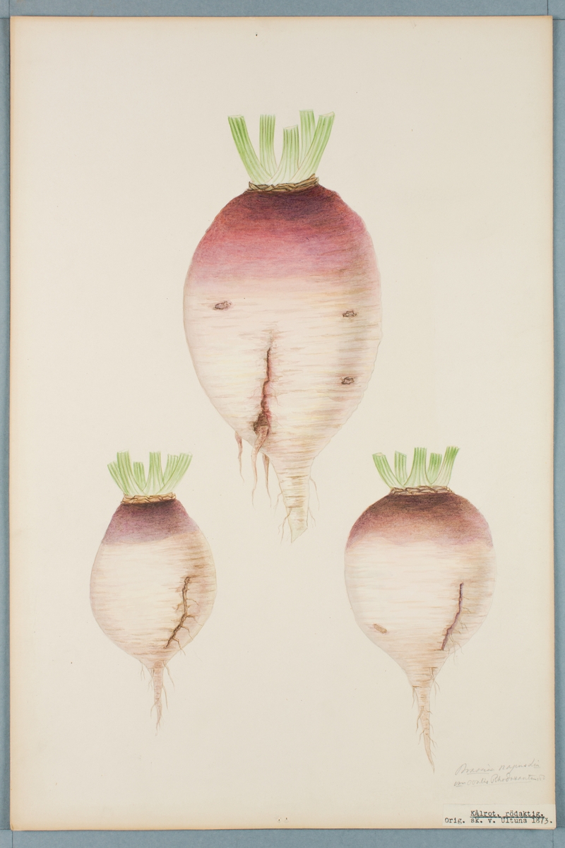 Sveriges kulturväxter. Illustration utförd av Henriette Sjöberg. Kålrot, rödaktig, rödtoppig. Odlad Ultuna 1873. Inv. nr. C101 : 289.