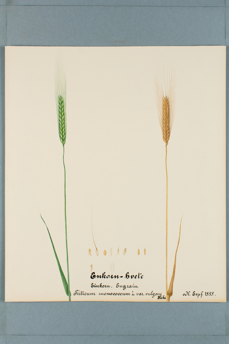 Sveriges kulturväxter. Illustration utförd av Henriette Sjöberg. Vete, Enkorn. Odlat Experimentalfältet 1888. Jämför NMA.0098655.