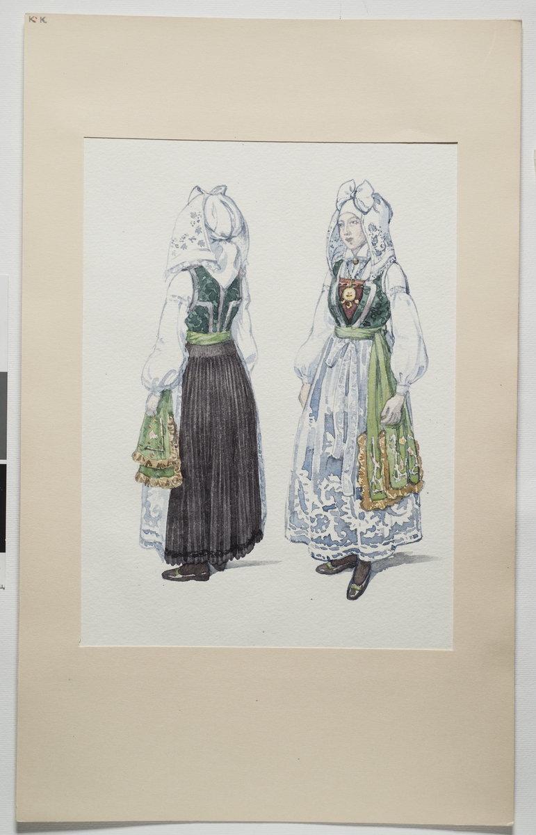 Festdräkt för gift kvinna Villands härad, Skåne. Akvarell av Emelie von Walterstorff.