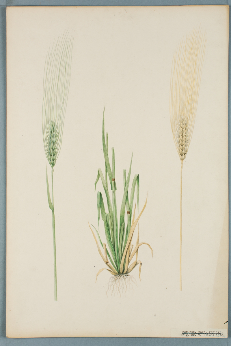 Sveriges kulturväxter. Illustration utförd av Henriette Sjöberg. Korn, sexradigt, vanligt. Odlat Ultuna 1870. Signerad "H.S.".
