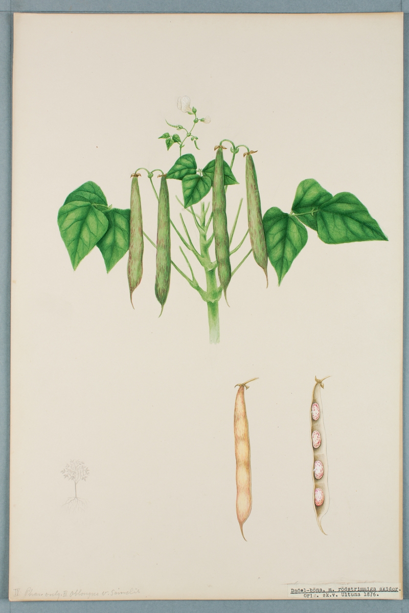 Sveriges kulturväxter. Illustration utförd av Henriette Sjöberg. Böna, Rödstrimmiga skidor. Odlad Ultuna 1876. Inv. nr. C101 : 454.