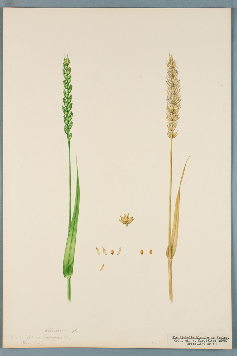 Sveriges kulturväxter. Illustration utförd av Henriette Sjöberg. Vete, Blé Richelle blanche de Naples. Odlat Experimentalfältet 1890. Eriksson 1892, nr. 6. Inv. nr. C101 : 19. Signerad "H.S. Exper 1890.".