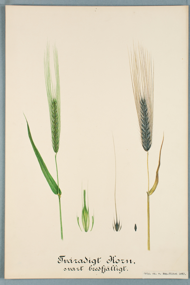 Sveriges kulturväxter. Illustration utförd av Henriette Sjöberg. Korn, tvåradigt, svart, bredfjälligt. Odlat Experimentalfältet 1887. Signerad "Henriette S.g 1887. Exper fält". Jämför NMA.0098602.