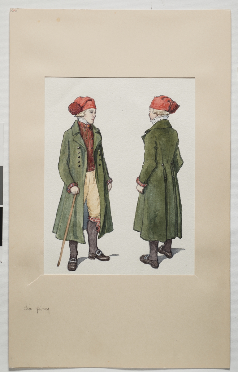 Högtidsdräkt för män Sorunda socken, Södermanland. Akvarell av Emelie von Walterstorff.