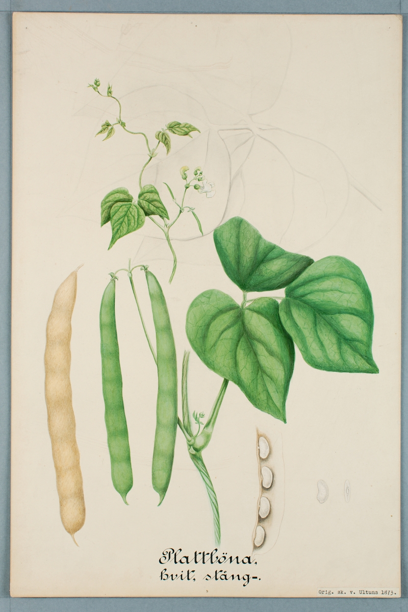 Sveriges kulturväxter. Illustration utförd av Henriette Sjöberg. Stor svärdsböna/stångböna, tysk, vit. Odlad Ultuna 1873. Inv. nr. C101 : 472.