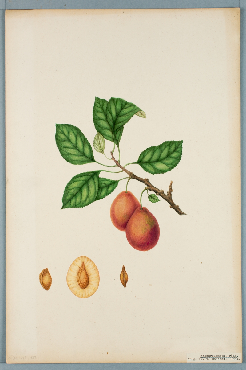 Sveriges kulturväxter. Illustration utförd av Henriette Sjöberg. Plommon, röda, Kejsarplommon. Odlade Rosendal 1884. Signerad "H.S.1883.".