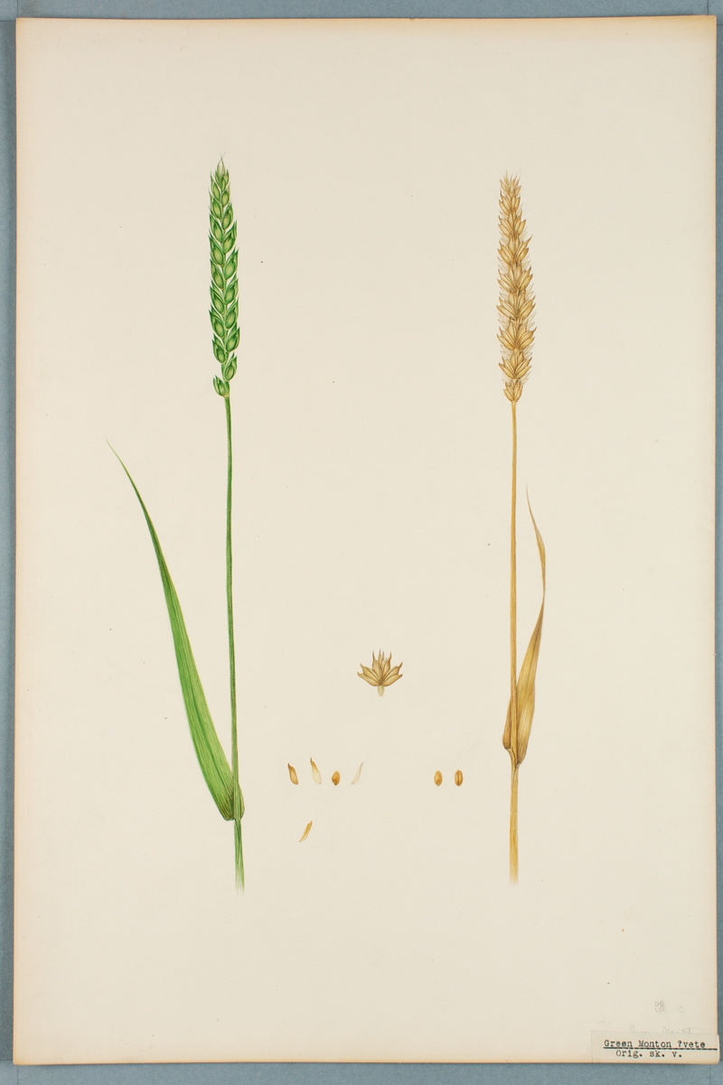 Sveriges kulturväxter. Illustration utförd av Henriette Sjöberg. Vete, Green Monton (?). Odlat Experimentalfältet 1891. Inv. nr. C101 : 47. Signerad "H.S. Exper. 1891.".