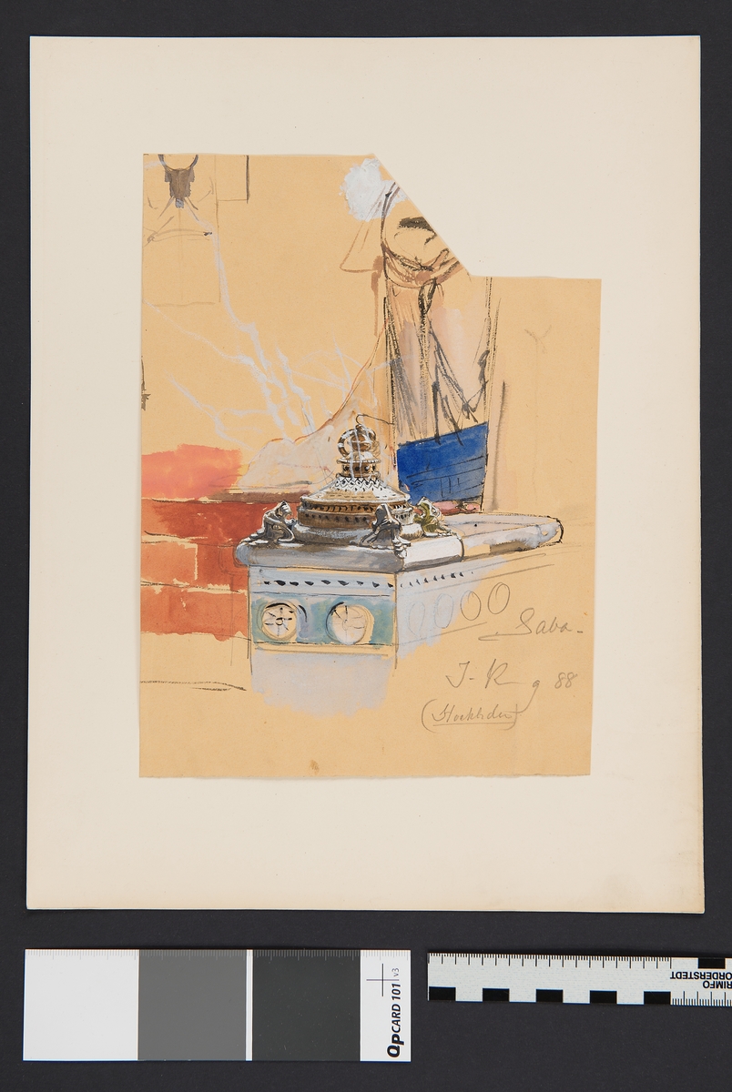 Akvarellerad, signerad skiss av Julius Kronberg med påskriften "Saba", daterad 1888. Monterad på kartong. Nm inv.nr 139565:11