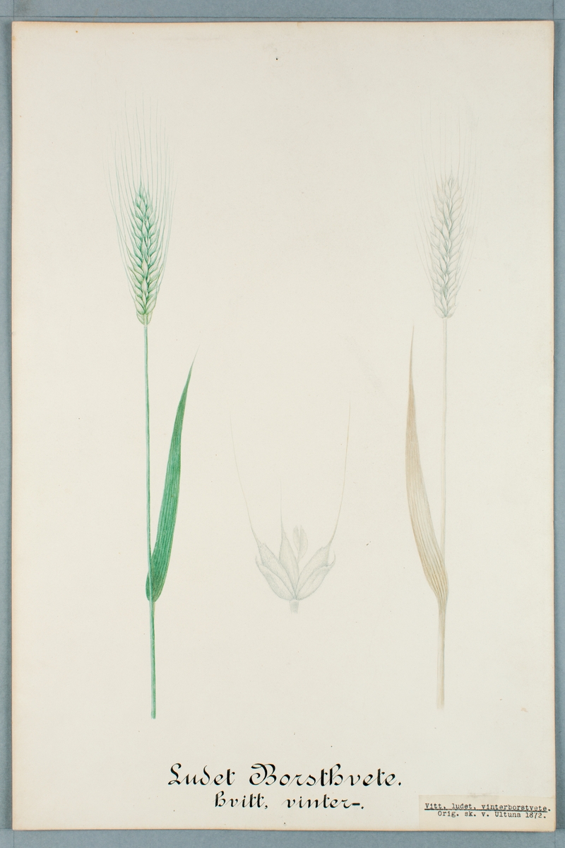 Sveriges kulturväxter. Illustration utförd av Henriette Sjöberg. Vete, vinterborstvete, Ultuna vitt, ludet. Odlat Ultuna 1872. Inv. nr. C101 : 26.