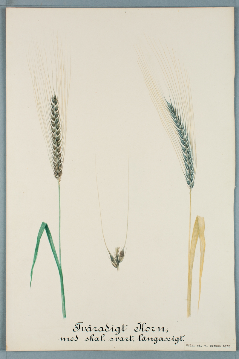 Sveriges kulturväxter. Illustration utförd av Henriette Sjöberg. Korn, tvåradigt, svart, långaxigt med skal. Odlat Ultuna 1872.