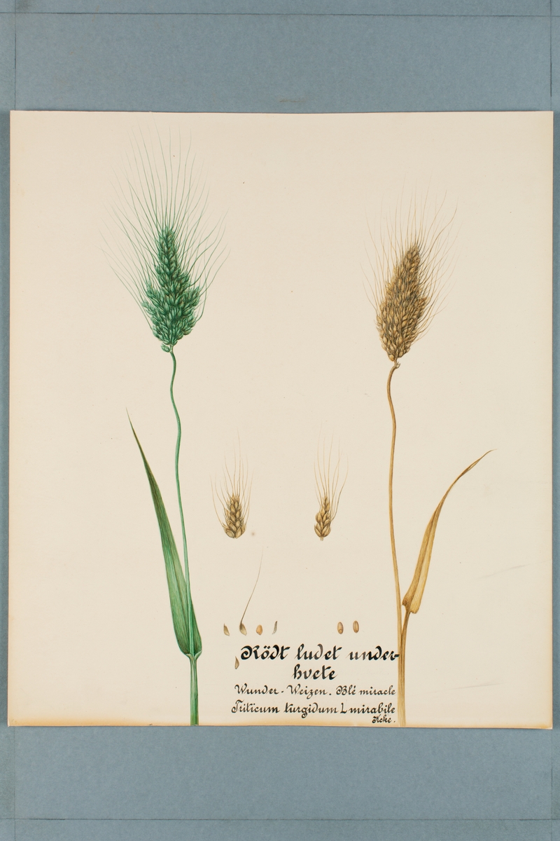 Sveriges kulturväxter. Illustration utförd av Henriette Sjöberg. Vete, Blé de Miracle/Wunder Weizen, rött, ludet, undervete. Odlat Experimentalfältet 1890 (uppgift om detta saknas på arket).