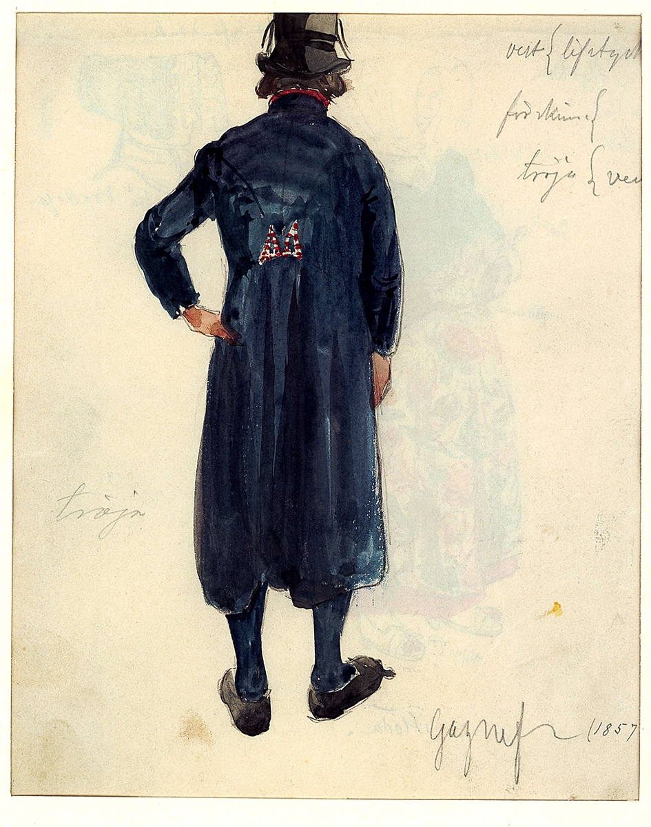 Folkdräkt, man. Gagnef socken, Dalarna. "Handteckning af J.W. Wallander, 1857. Ur en af Wallanders skissböcker/ med auktionsnumret 3671". Inv nr 57339.c. Akvarellerad teckning.