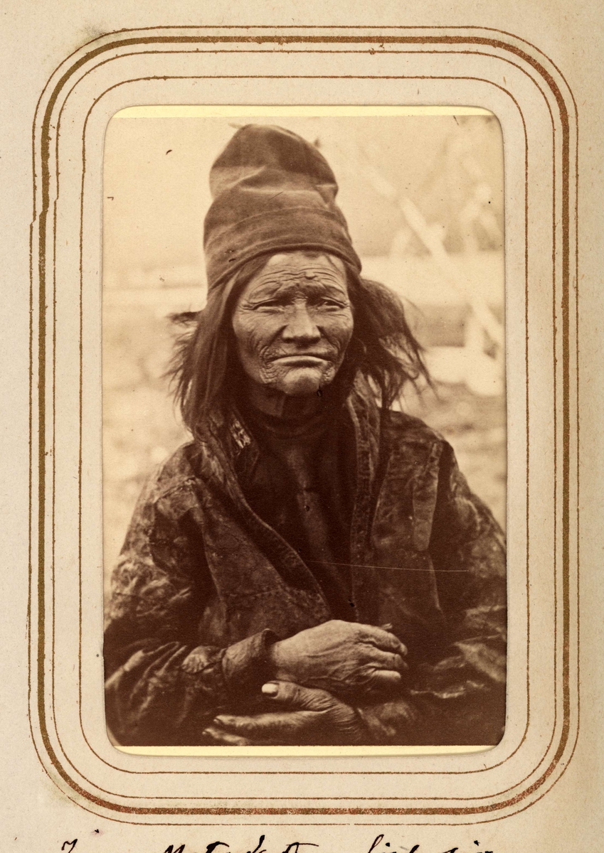 Inga Matsdotter Sjålsa, 76 år, Sjokksjokks sameby, Jokkmokks sn. Ur Lotten von Dübens fotoalbum med motiv från den etnologiska expedition till Lappland som leddes av hennes make Gustaf von Düben 1868.