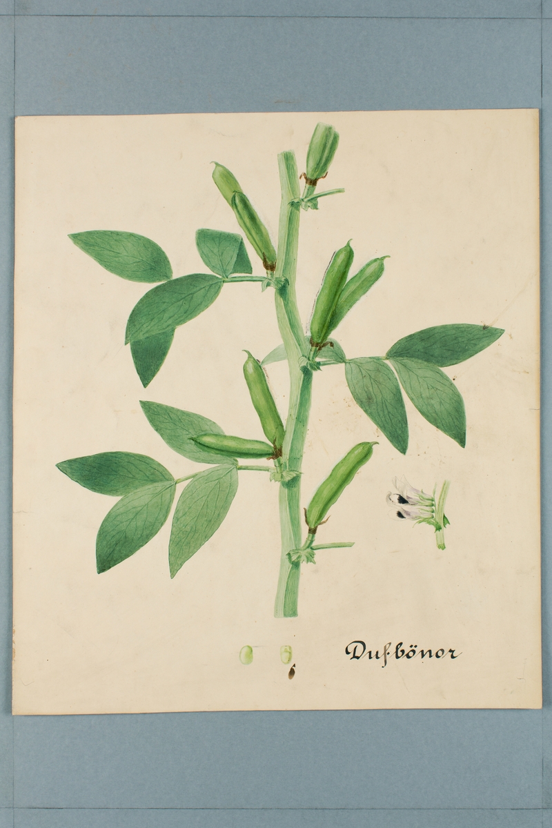 Sveriges kulturväxter. Illustration utförd av Henriette Sjöberg. Böna, bondböna/duvböna. Odlad Ultuna, datering saknas. Inv. nr. C101 : 441.