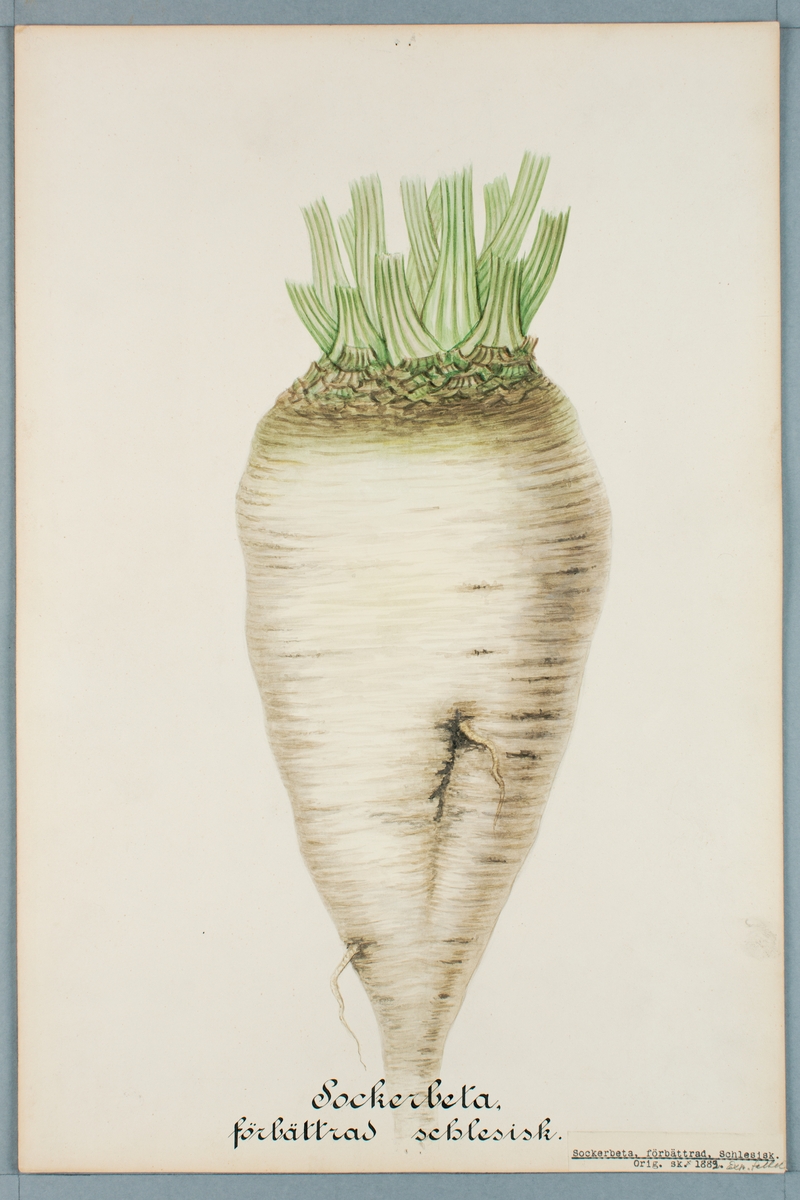 Sveriges kulturväxter. Illustration utförd av Henriette Sjöberg. Sockerbeta, Schlesisk förbättrad. Odlad Experimentalfältet 1882. Inv. nr. C101 : 255. Signerad "H.S. 1883.".