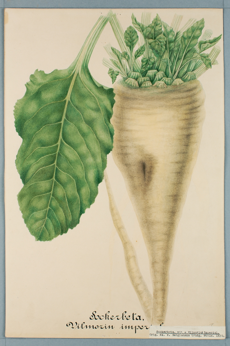 Sveriges kulturväxter. Illustration utförd av Henriette Sjöberg. Sockerbeta, vit Valmorins Imperial. Odlad Bergianska trädgården, Stockholm 1870. Inv. nr. C 101 : 256.