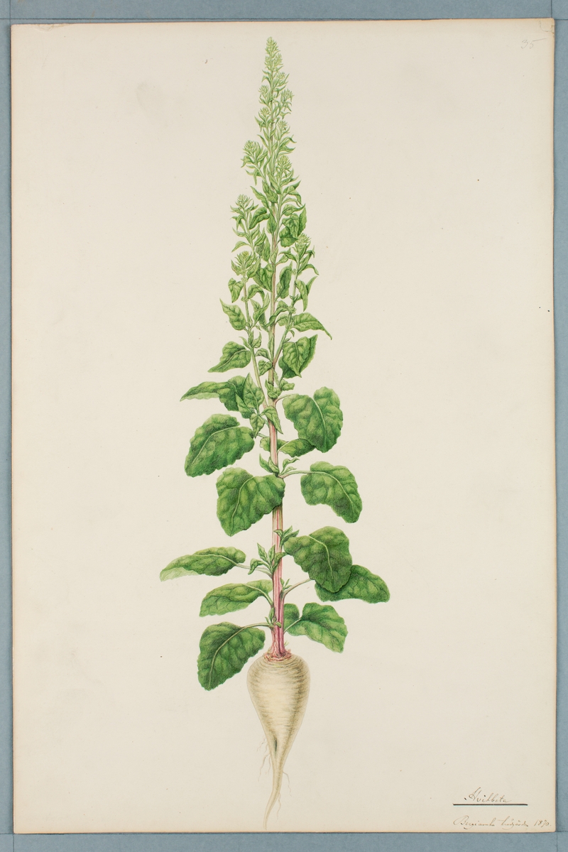 Sveriges kulturväxter. Illustration utförd av Henriette Sjöberg. Vitbeta. Odlad Bergianska trädgården, Stockholm 1870. Inv. nr. C101 : 246.