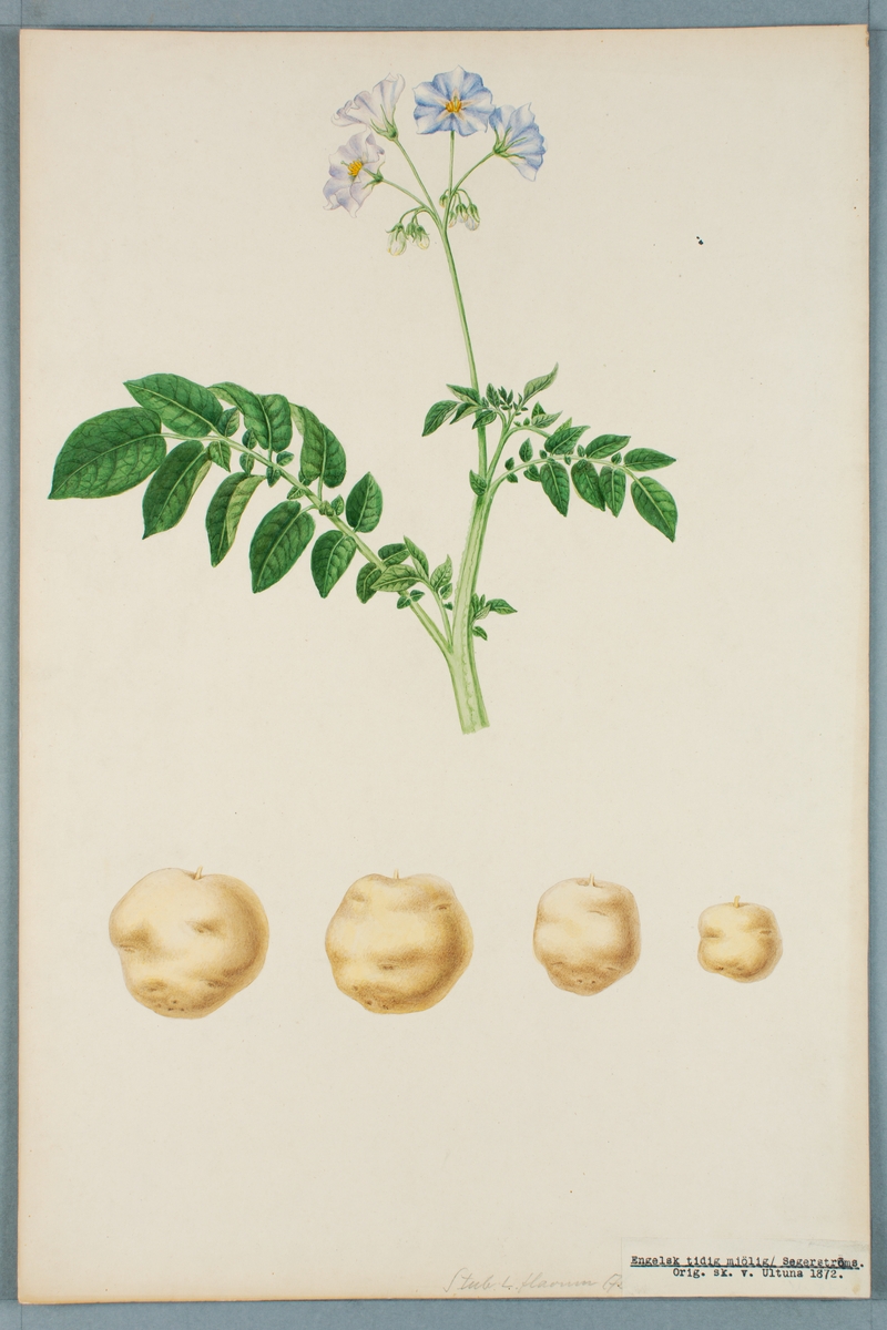 Sveriges kulturväxter. Illustration utförd av Henriette Sjöberg. Potatis, vitgul, Engelsk tidig mjölig/Segerströms. Odlad Ultuna 1872. Inv. nr. C101 : 320.