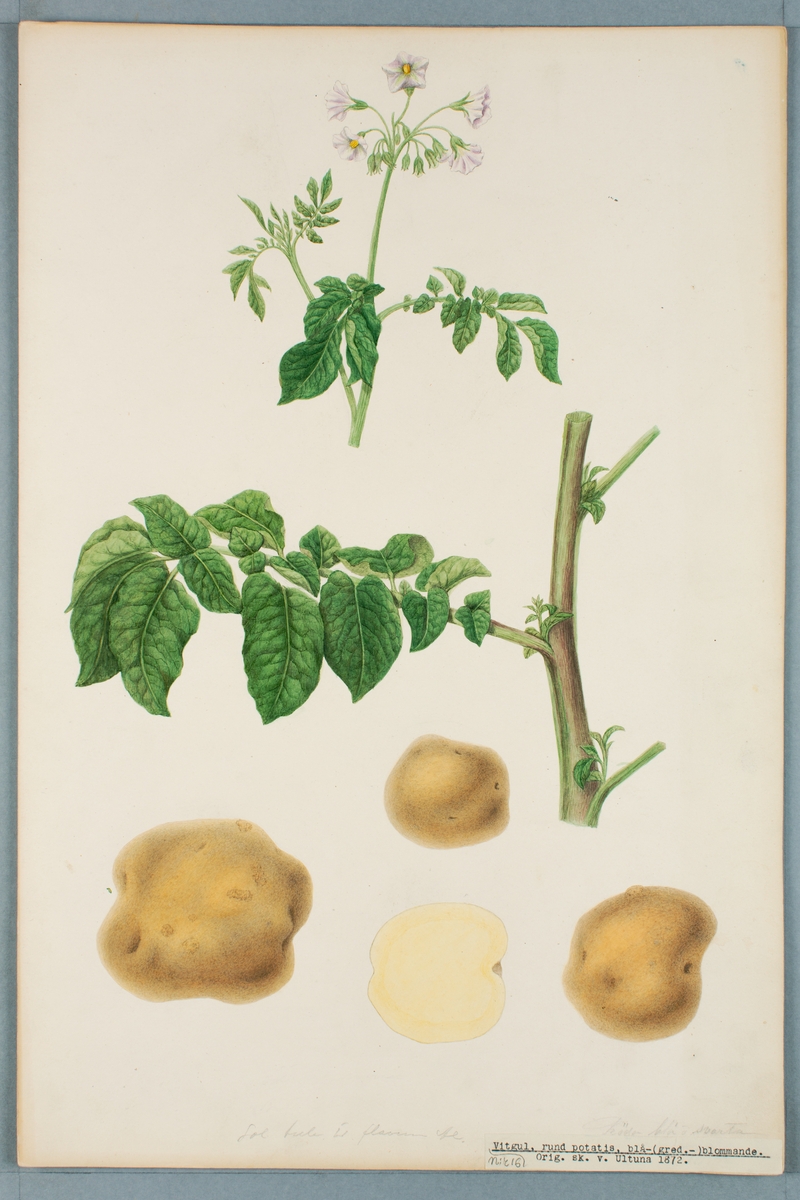 Sveriges kulturväxter. Illustration utförd av Henriette Sjöberg. Potatis, vitgul, nr. 16. Odlad Ultuna 1872. Inv. nr. C101 : 324.