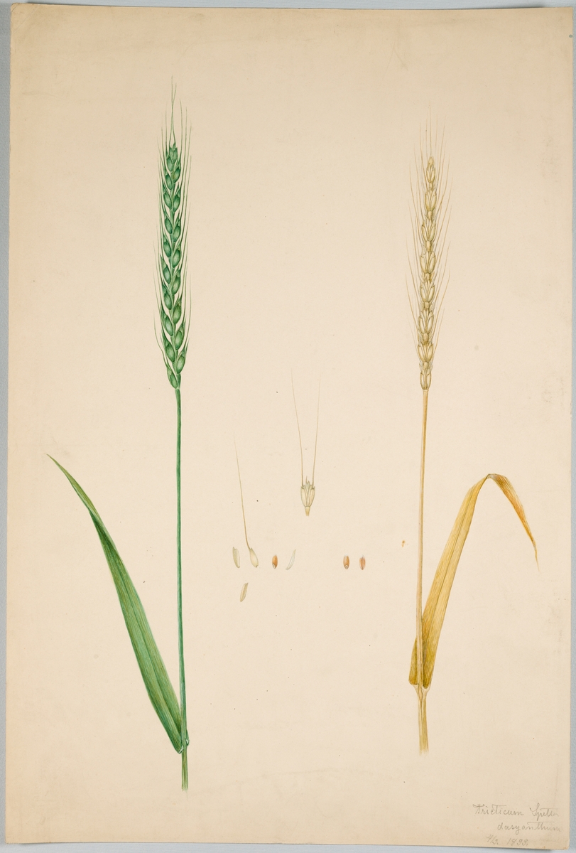 Sveriges kulturväxter. Illustration utförd av Henriette Sjöberg. Vete, spelt. Påskrift med blyerts på framsidan "Triticum Spelta dasyanthum 4/9 1893.". Troligen odlat Experimentalfältet. I Kungliga Skogs och Lantbruksakademiens (KSLA) bibliotek (stämplad på baksidan). Signerad "HS. 1893. Exp.".
