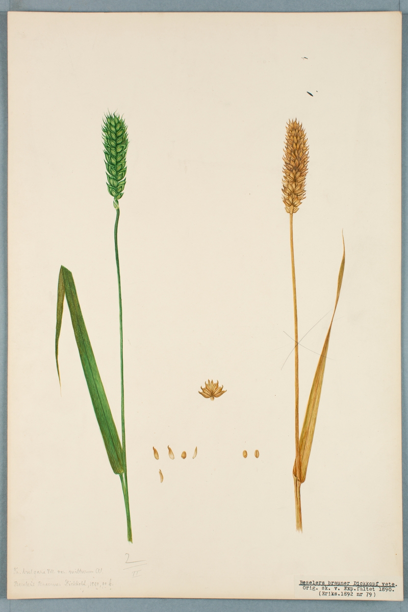 Sveriges kulturväxter. Illustration utförd av Henriette Sjöberg. Vete, Beselers brauner Dickkopf. Odlat Experimentalfältet 1890. Eriksson 1892, nr. 79. Inv. nr. C101 : 6. Signerad "H.S. 1889. Exp.".