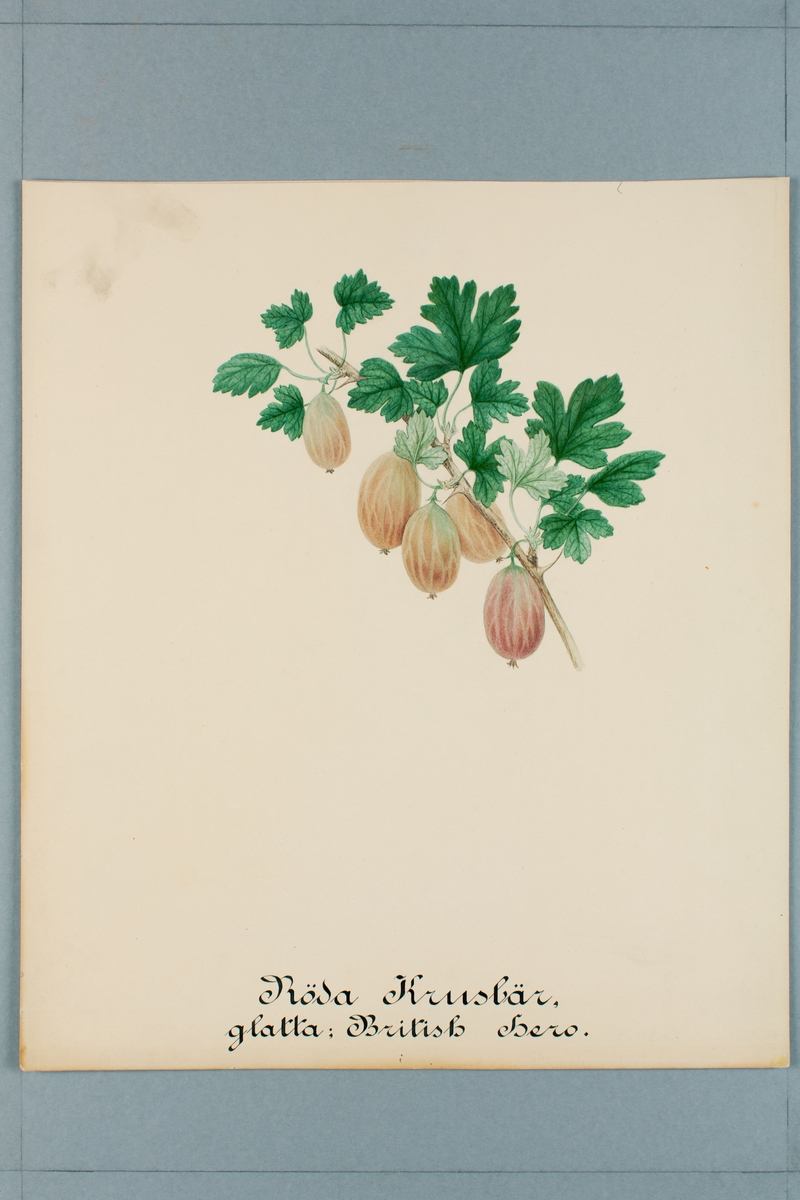 Sveriges kulturväxter. Illustration utförd av Henriette Sjöberg. Krusbär, röda, släta, Brittish Hero. Odlingsplats och datering saknas.