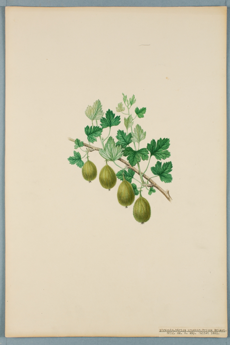 Sveriges kulturväxter. Illustration utförd av Henriette Sjöberg. Krusbär, mörkgula, håriga, Prince Ernest. Odlade Experimentalfältet 1881. Signerade "H.S. 81."