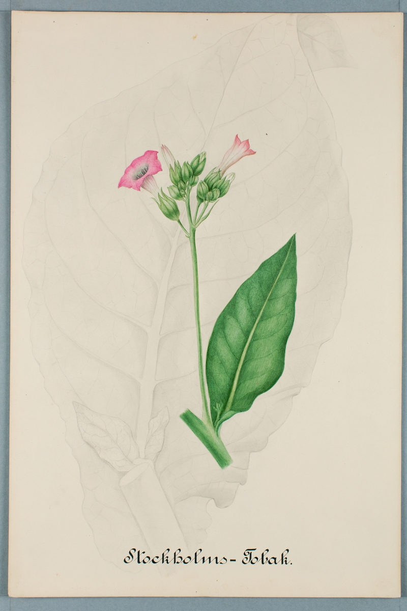 Sveriges kulturväxter. Illustration utförd av Henriette Sjöberg. Stockholms tobak. Odlad Experimentalfältet 1881.