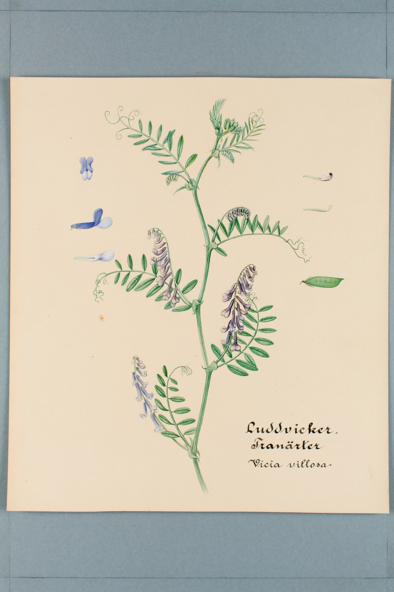 Sveriges kulturväxter. Illustration utförd av Henriette Sjöberg. Luddvicker/tranärter. Odlingsplats och datering saknas.