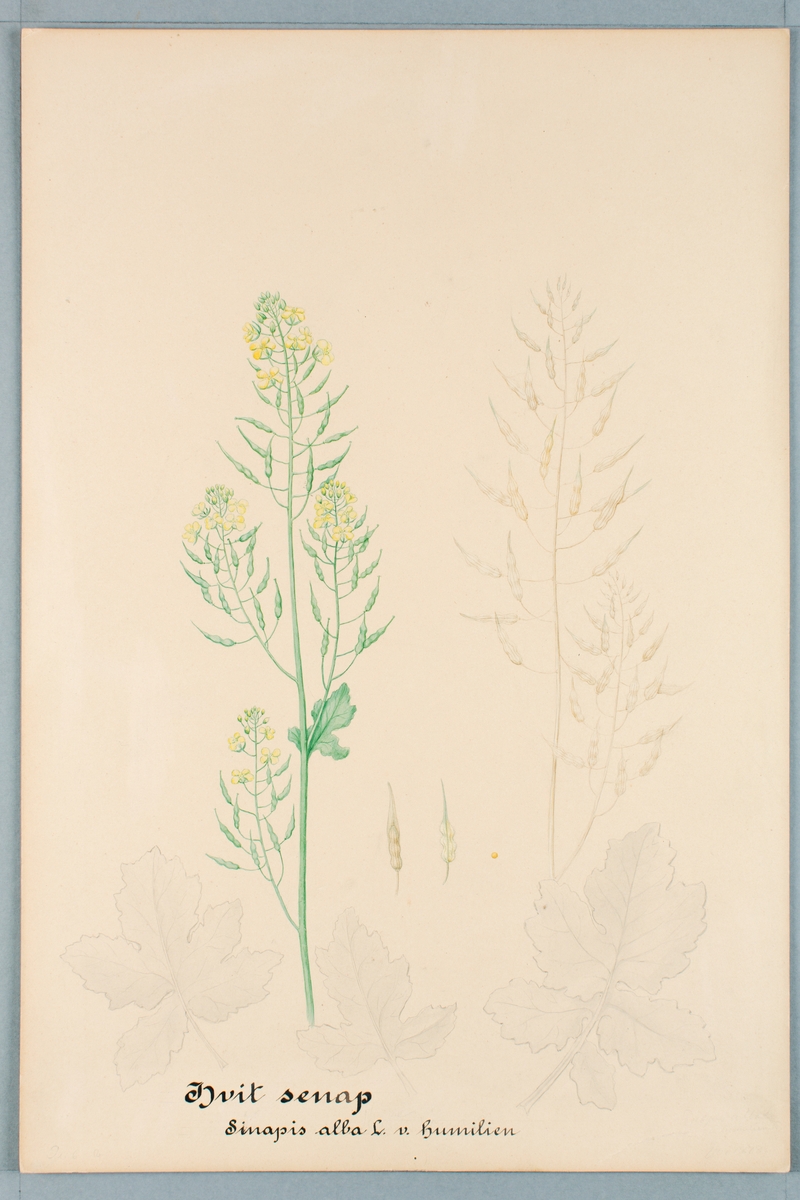 Sveriges kulturväxter. Illustration utförd av Henriette Sjöberg. Vit senap. Odlingsplats och datering saknas.