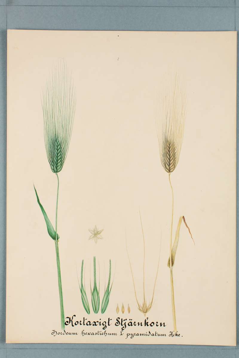 Sveriges kulturväxter. Illustration utförd av Henriette Sjöberg. Korn, Stjärnkorn, kortaxigt. Troligen odlat Experimentalfältet 1887. Signerad "Henriette S.g. 1887 Exper fälte.".