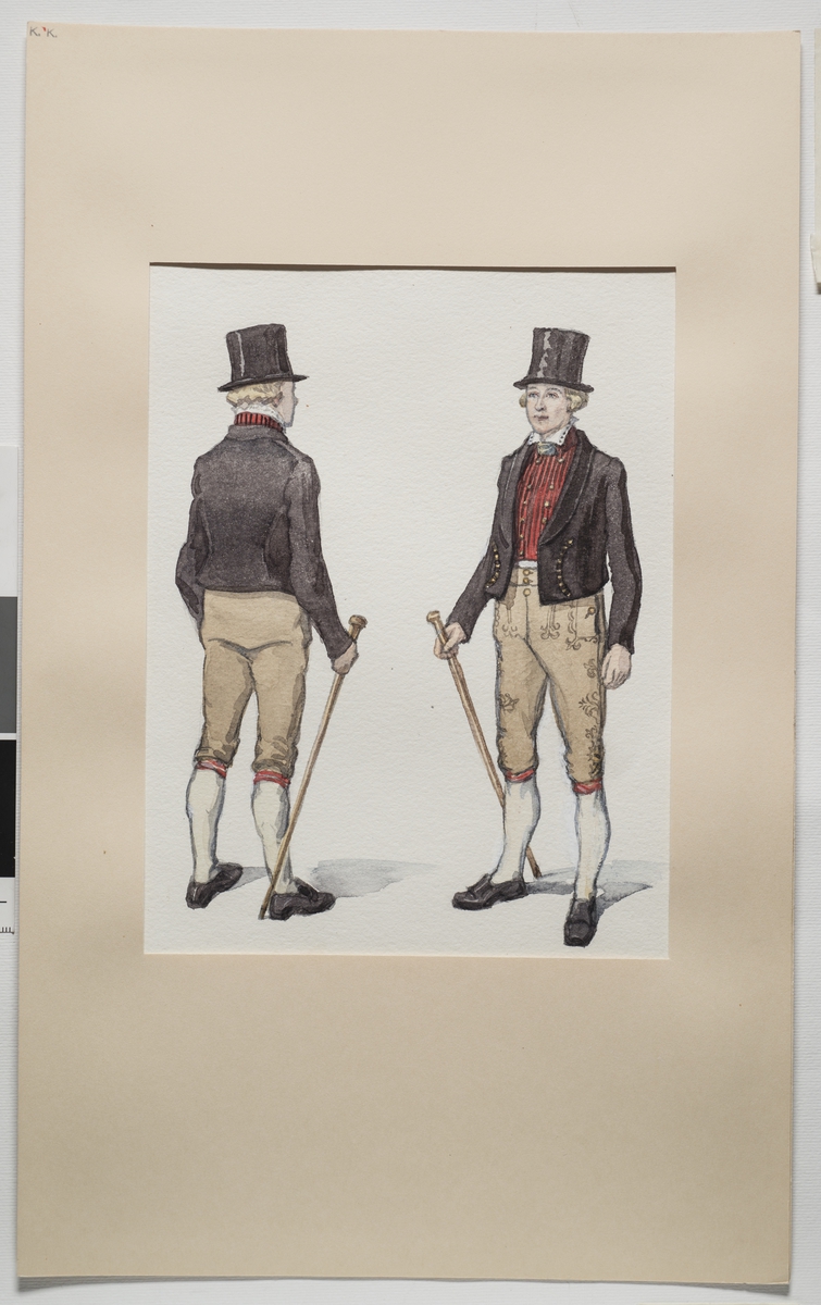 Helgdagsdräkt för män, Häverö socken, Uppland. Akvarell av Emelie von Walterstorff.