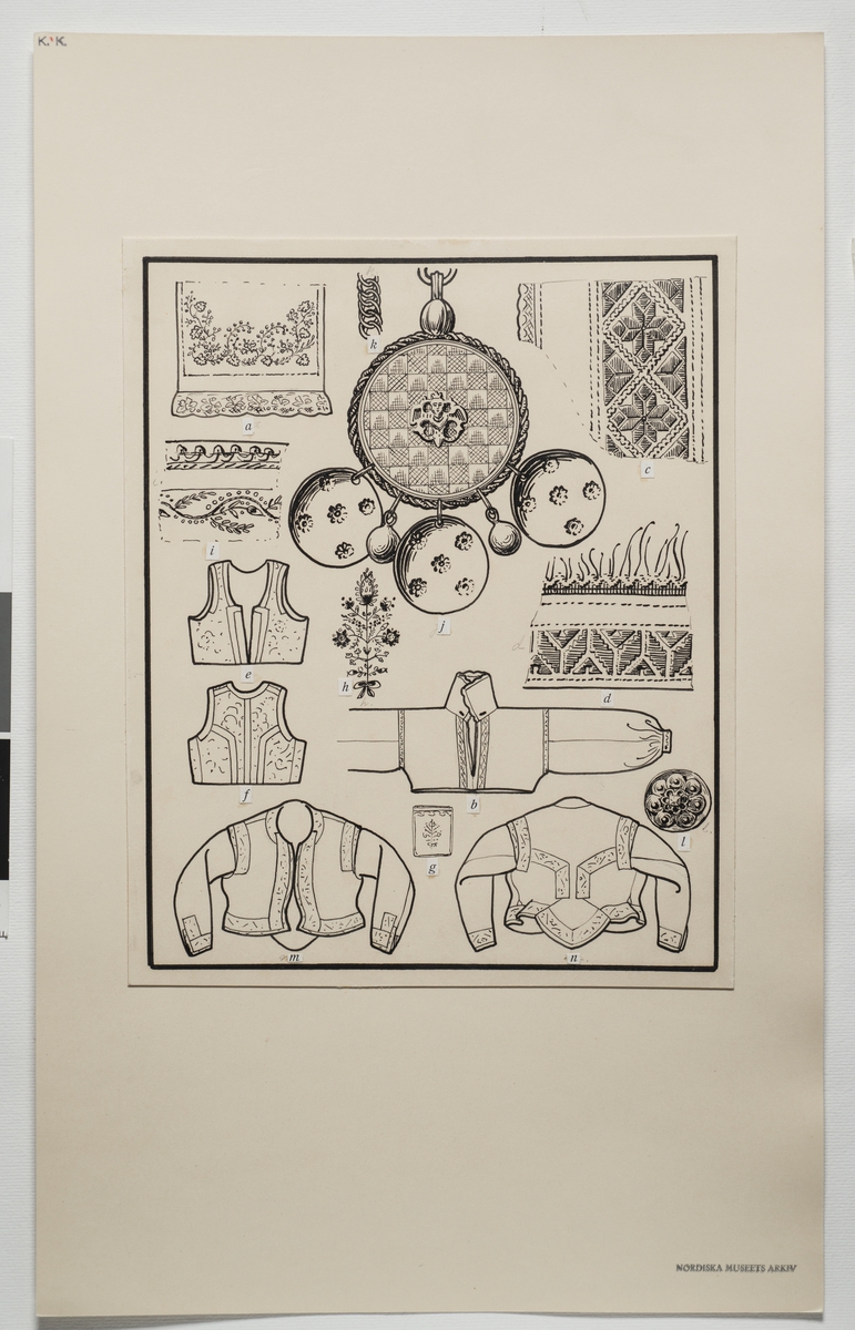 Festdräkt för gift kvinna Villands härad, Skåne. Teckning av Emelie von Walterstorff.