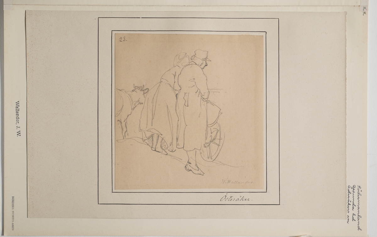 Blyertsskiss, nr 23, Österåker, En ko, en kvinna och en man stående mot en vagn med ryggen mot betraktaren. J.W. Wallander. Södermaland, Oppunda hd, Österåker sn.