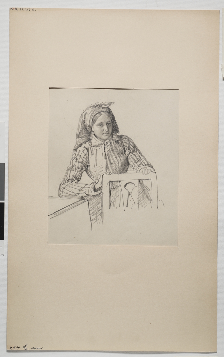Blyertsskiss, bröstbild av en kvinna med huvudduk, sittande bakom en stol. J.W. Wallander. Kvinnodräkt från Österåker.