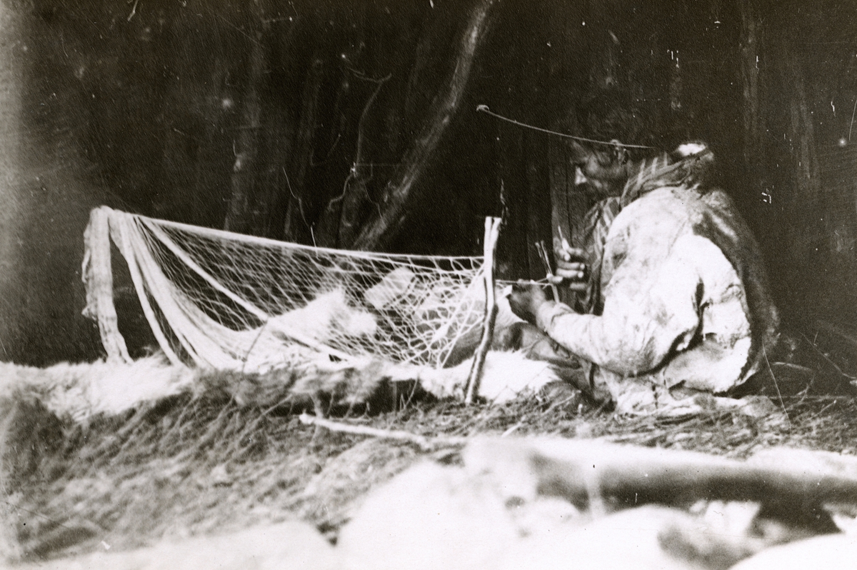 Påskrift på monteringen: "Erik Marsja binder nät. (Nätets borter ända fästar utanför kåtan, nätet instucket genom ett av 'draghålen', 'biegga-raije'.)" Tjuonajokk, Norrkaitum, Gällivare socken, Lappland.