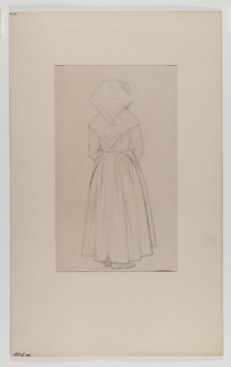 Handteckning, sannolikt av J P Södermark. Kvinnodräkt från Tuna, Dalarna.