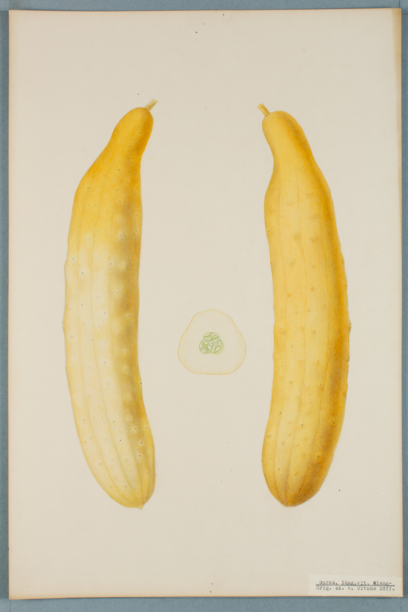 Sveriges kulturväxter. Illustration utförd av Henriette Sjöberg. Gurka, lång, vit, Slanggurka. Odlad Ultuna 1877. Inv. nr. C101 : 507.