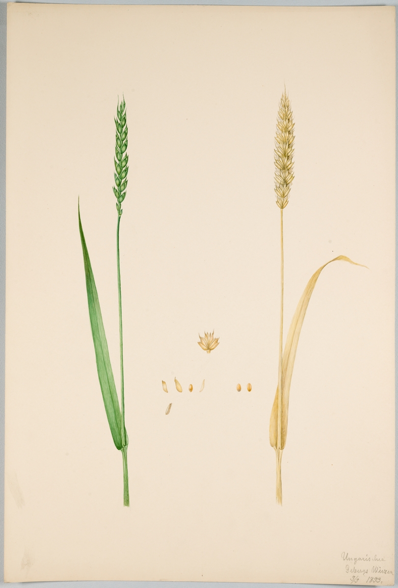 Sveriges kulturväxter. Illustration utförd av Henriette Sjöberg. Vete. Påskrift med blyerts på framsidan "Ungarischer Gebirgs Weizen 3/9 1893.". Troligen odlat Experimentalfältet. I Kungliga Skogs och Lantbruksakademiens (KSLA) bibliotek (stämplad på baksidan). Signerad "H.S. 1893. Experim".