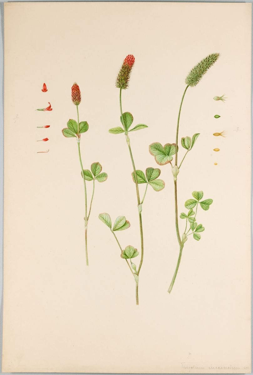 Sveriges kulturväxter. Illustration utförd av Henriette Sjöberg. Klöver, Blodklöver. Påskrift med blyerts på framsidan "Trifolium incarnatum 1894.". Troligen odlad Experimentalfältet. I Kungliga Skogs och Lantbruksakademiens (KSLA) bibliotek (stämplad på baksidan). Signerad "H.S. 1894. Exp.".