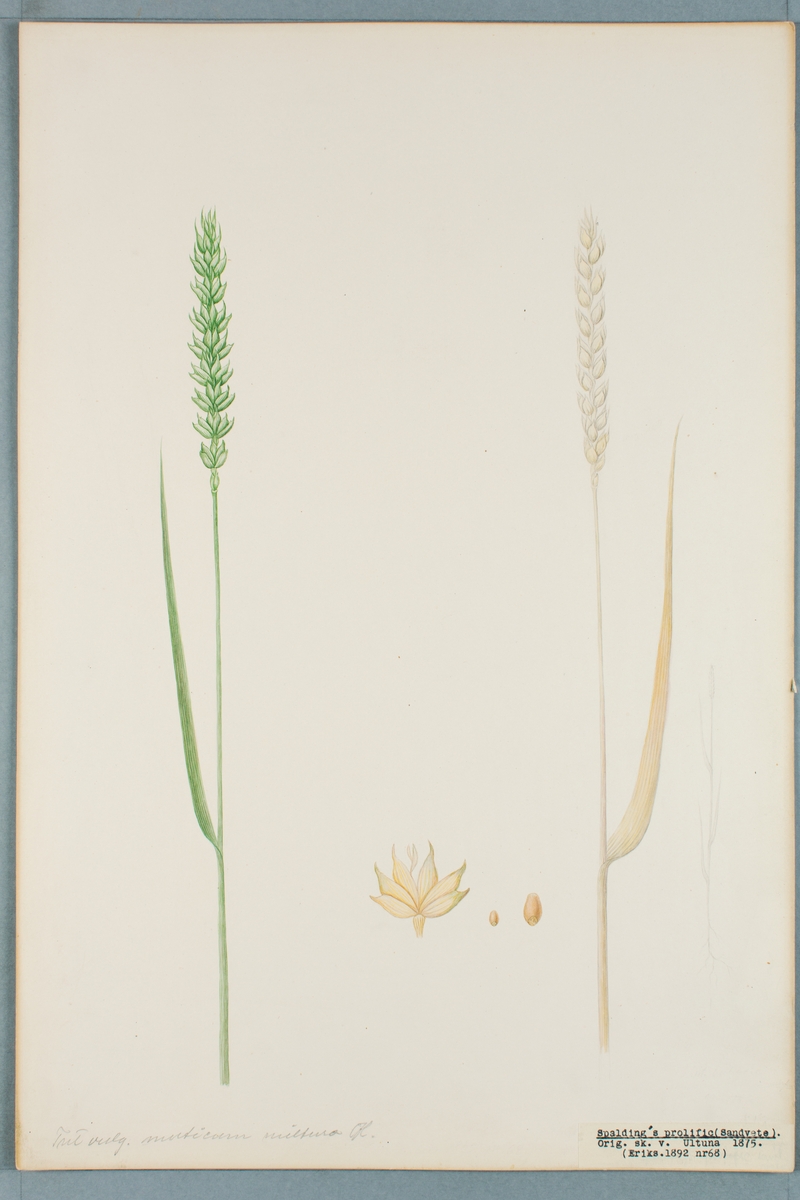 Sveriges kulturväxter. Illustration utförd av Henriette Sjöberg. Vete, Spalding's prolific, sandvete. Odlat Ultuna 1875. Eriksson 1892, nr. 68. Inv. nr. C101 : 95.