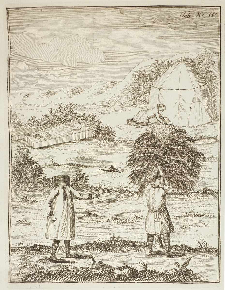 Stick ur Knud Leems bok: Beskrivelse over Finmarkens lapper, deres tungemaal, levemaade og forrige afgudsdyrkelse med J.E. Gunneri Anmaerkninger. Tab. XCIV. Begravning.