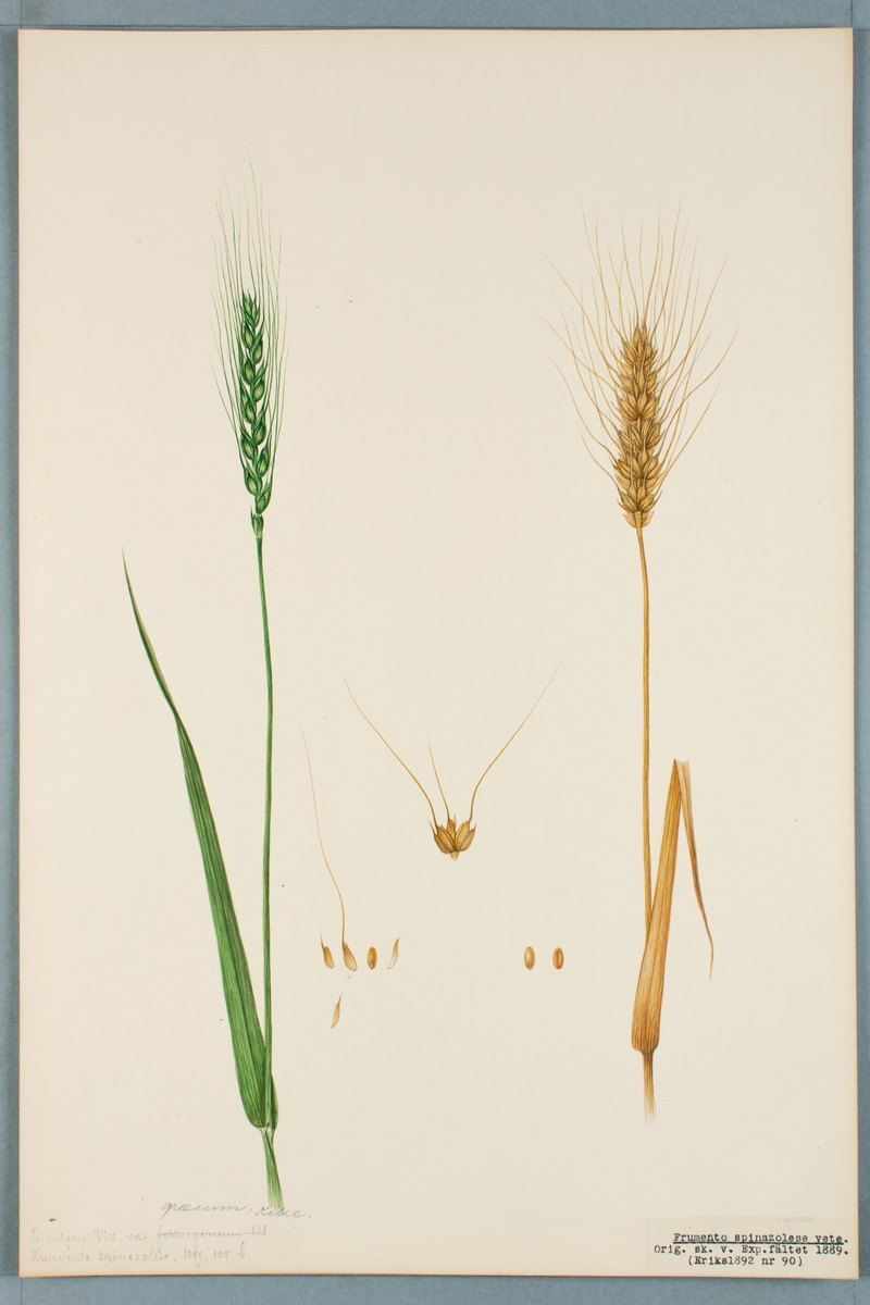 Sveriges kulturväxter. Illustration utförd av Henriette Sjöberg. Vete, Frumento spinazolese. Odlat Experimentalfältet 1889. Eriksson 1892, nr. 90. Inv. nr. C101 : 42. Signerad "H.S. 1889. Exp.". Jämför NMA.0098505.